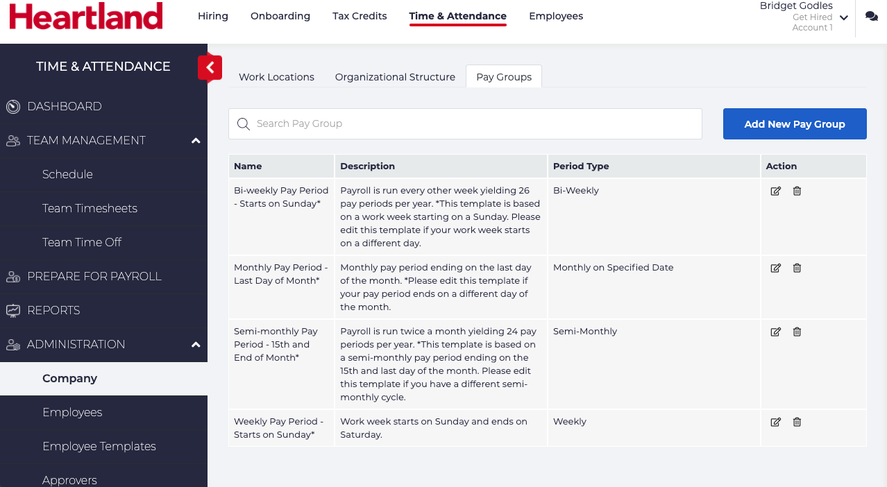 Pay Groups allow you to set your Employees’ pay frequency (weekly, biweekly, semi-monthly, monthly). After the initialization process the most common pay periods will be added to your Pay Groups. You are able to add more if required, but these will handle most of your employee’s needs. For more information on Pay Groups or creating a custom Pay Group, please see our support documentation.